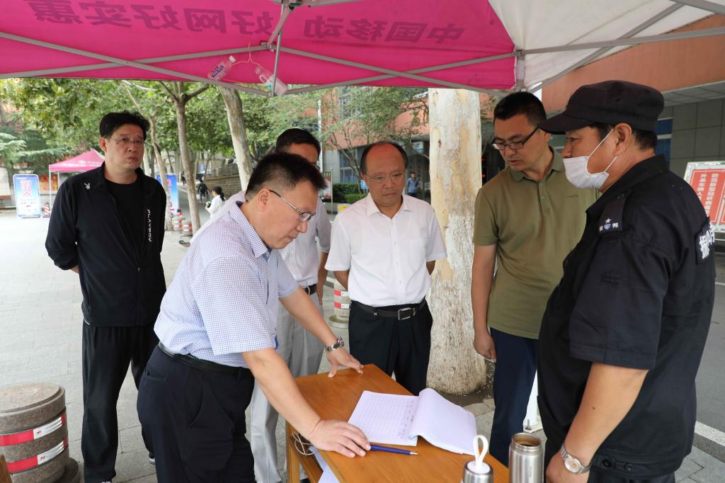 吕涛一行到学校南门、东门实地检查调研了学生返校有关疫情防控措施,到图书馆、大学生自主学习中心、第三学生餐厅、知行楼、至善楼、学生公寓等处实地检查调研了开学前各项工作准备情况。办公室、教务处、学生工作处、后勤管理处、保卫处等部门负责同志及相关人员陪同调研。