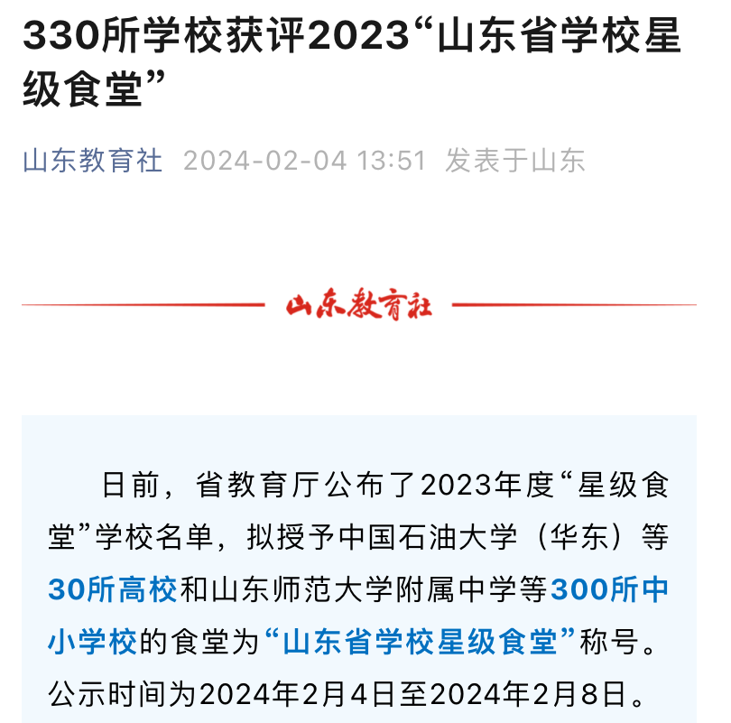 日前,省教育厅公布了2023年度“星级食堂”学校名单,学校第四餐厅荣获“星级食堂”称号。
