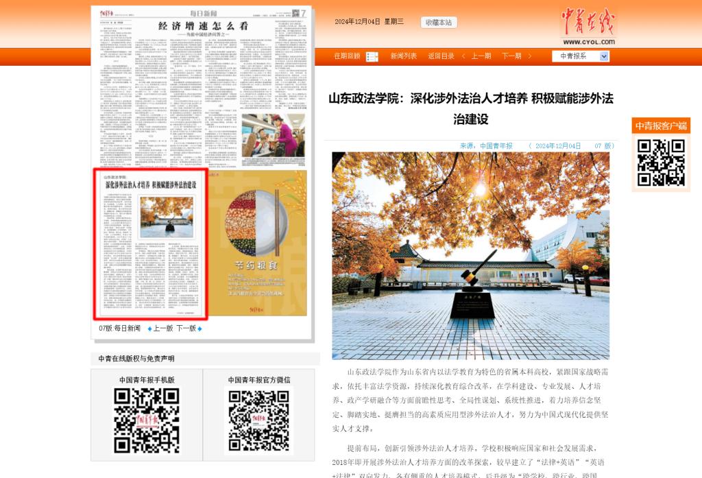 12月4日,《中国青年报》第07版以《深化涉外法治人才培养 积极赋能涉外法治建设》为题报道我校涉外法治人才培养成效。