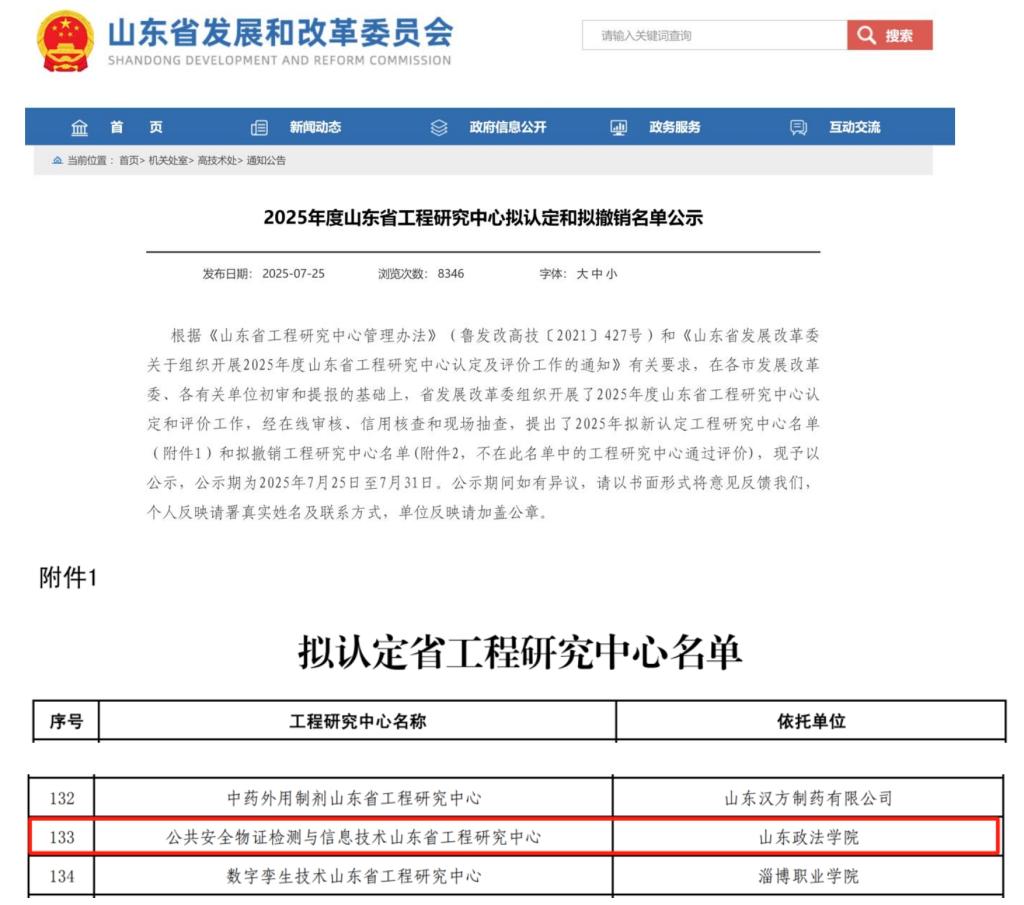 近日,山东省发展和改革委员会发布通知公告,由山东政法学院法庭科学研究院/司法鉴定中心申报的“公共安全物证检测与信息技术山东省工程研究中心”获批成立。这一省级科研平台的落地,标志着我校在科研创新体系建设方面取得新突破。