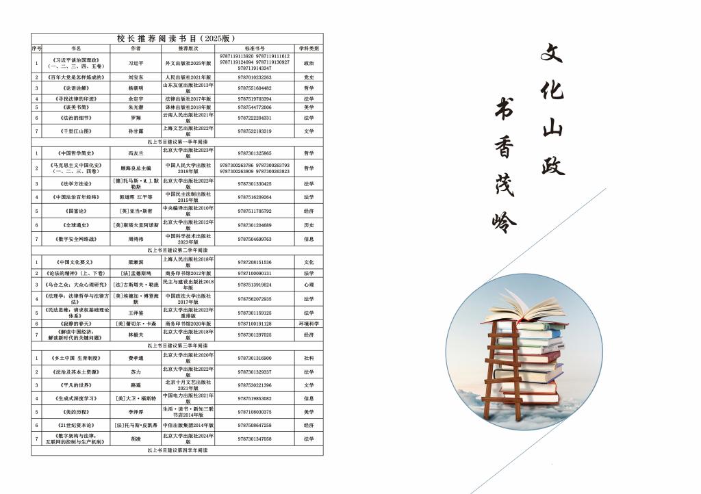 为深入贯彻“文化山政”发展战略,进一步营造浓厚的“全民阅读”校园氛围,扎实推进“书香校园”建设,山东政法学院近日完成并正式推出2025版《校长推荐阅读书目》。新版书目共收录28部经典著作,内容广泛涵盖政治、经济、管理、法律、文学、哲学、社会科学、心理学以及传统文化等重要领域,均为各学科具有代表性的经典文献。
