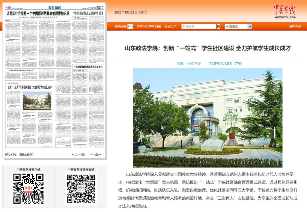 山东政法学院通过“一站式”学生社区建设,实现了育人资源的有效整合、育人载体的创新升级、育人成效的显著提升,成功构建起空间融合、队伍聚合、资源整合、成效综合的育人新生态。展望未来,学校将立足新形势新任务,坚持守正创新,推动学生社区建设向更深层次、更高质量迈进,持续谱写育人工作新篇章。
