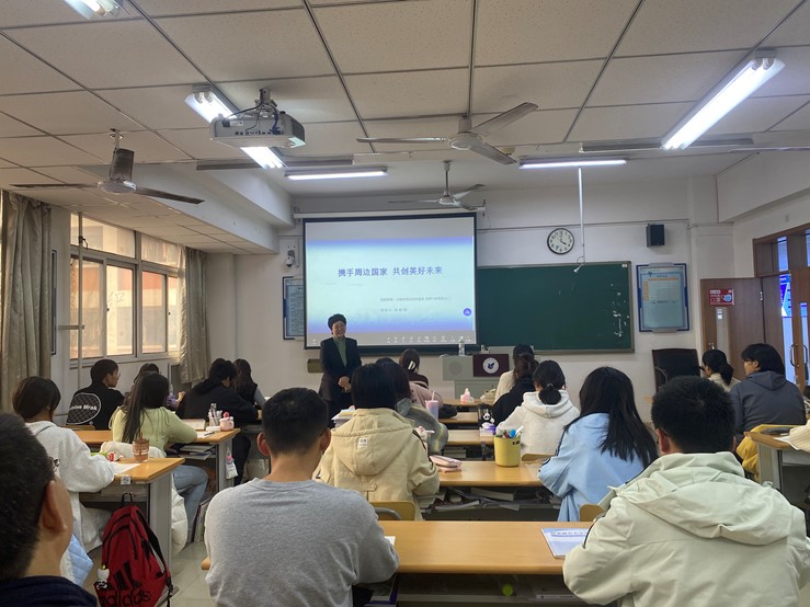 课堂上,胡晓清首先为同学们梳理中国周边的区域划分逻辑,结合地理区位与国际关系特征,详细介绍了东北亚、中亚、东南亚等重点区域的代表性国家及其与中国的互动基础;随后,她结合近期国际热点事件深入剖析中国与周边国家关系的战略重要性,进而引出中国秉持的“亲诚惠容”周边外交理念,并通过具体合作案例,让同学们直观理解这一理念的实践内涵与时代价值。