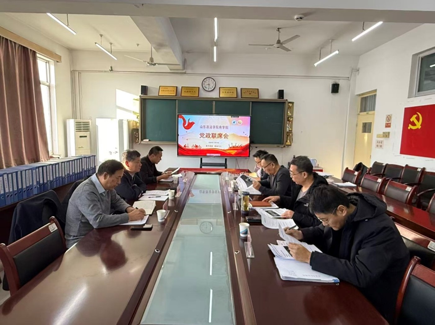 11月27日,山东政法学院商学院在笃行楼4层会议室召开党政联席会。学校党委委员、副院长蒋海升列席指导。会议由商学院党委书记刘涛主持,学院全体党委委员参加。