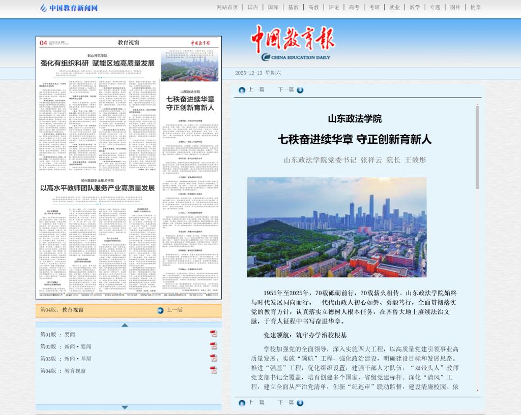 2025年12月23日,山东政法学院将迎来建校七十周年华诞。12月13日,《中国教育报》第4版“教育视窗”以《七秩奋进续华章 守正创新育新人》为题,专题报道学校办学特色和发展成就。文章由党委书记张祥云、院长王效彤署名,全面梳理总结了学校在党的建设、人才培养、学科建设、师资队伍、科研创新、文化建设、治理体系、智慧校园、对外开放等方面的实践与成果。现将报道全文转发如下:
