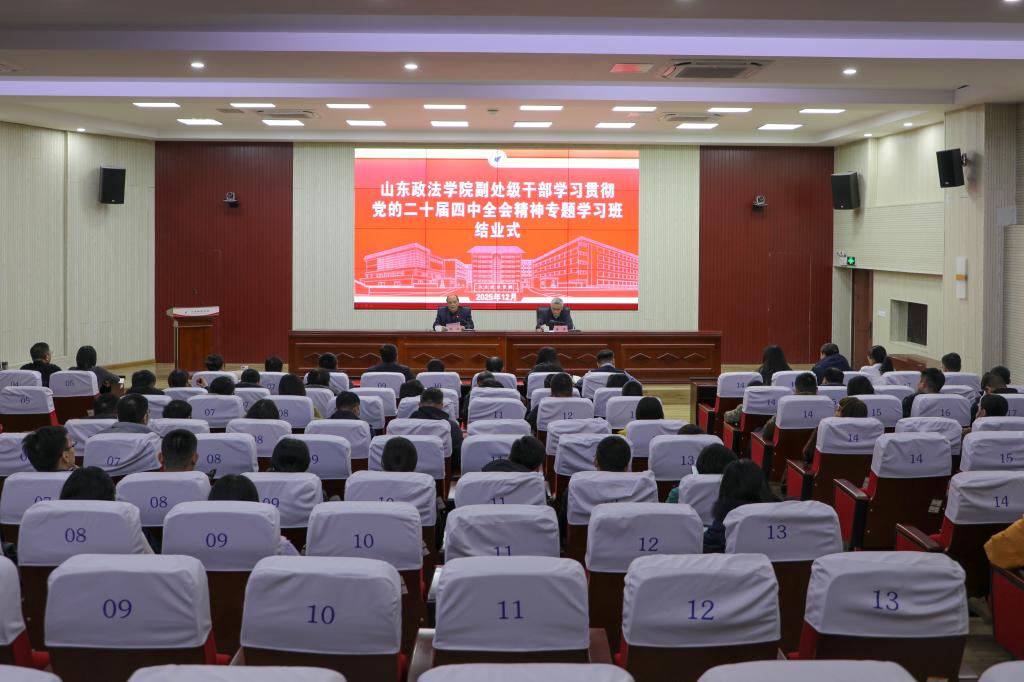 为深入学习贯彻党的二十届四中全会精神,根据党中央决策部署、省委和省委教育工委工作安排,12月10日至12日,山东政法学院举办副处级干部学习贯彻党的二十届四中全会精神专题学习班。党委书记张祥云出席开班式并作专题辅导报告。党委副书记赵斌主持开班式、出席结业式并讲话。党委委员、组织部(党校)部长(分管日常工作的副校长)张翚主持结业式。