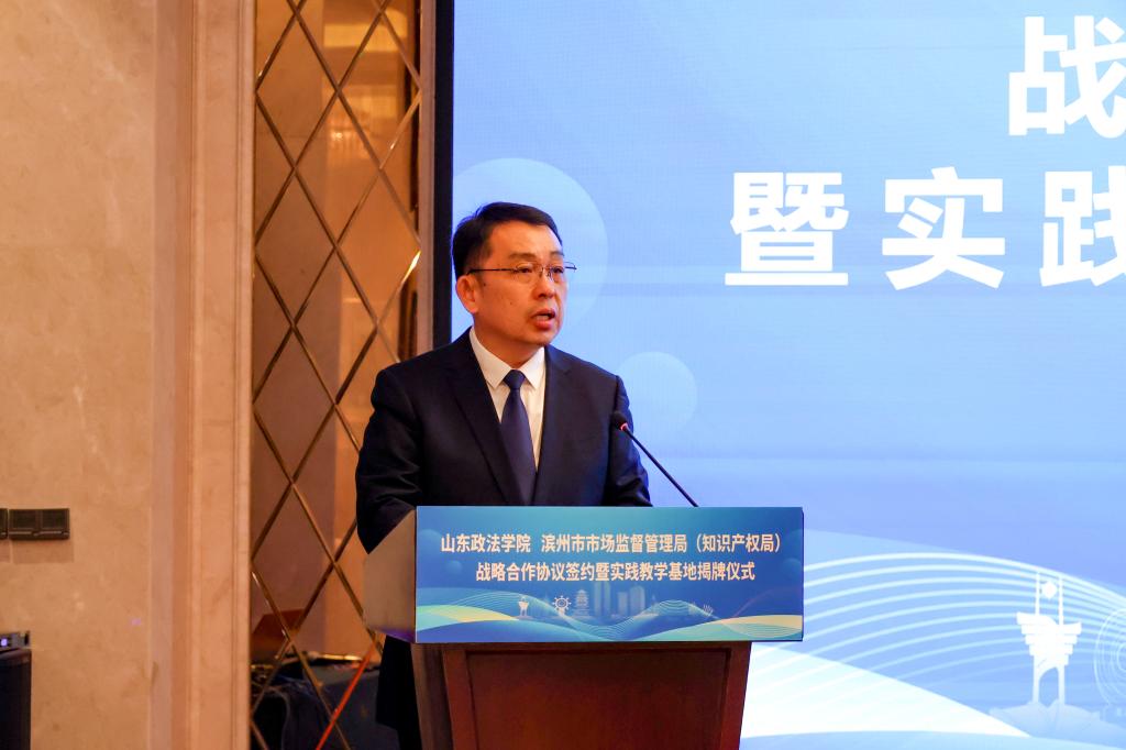 仪式上,王效彤对滨州市人民政府、滨州市市场监督管理局(知识产权局)长期以来对学校事业发展给予的支持表示感谢,并就学校基本情况、发展历程、人才培养等进行了详细介绍。他指出,山东政法学院学科、人才优势突出,合作资源丰富,已与多地多部门建立合作关系。此次与滨州市市场监管局合作,是深入学习贯彻习近平法治思想,全面落实两办意见的重要举措,学校将整合资源,围绕滨州新兴产业法治保障、法治滨州建设、涉外法治服务、黄河战略法治保障等多领域深化合作,输送优质法律人才,提供智力支持,实现校地共赢,助力滨州高质量发展与法治山东建设。