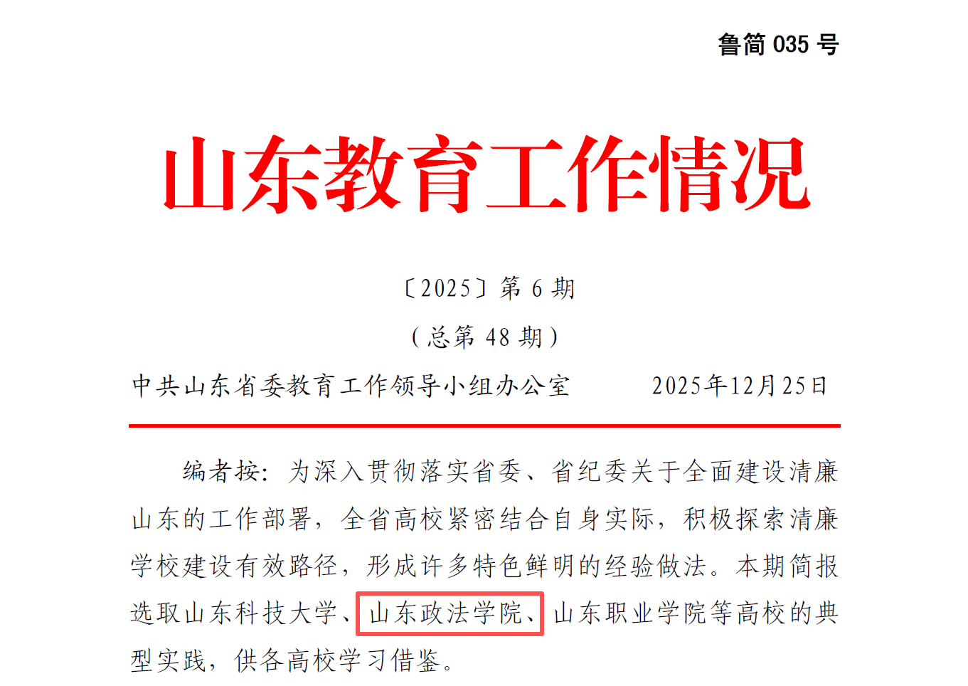 《山东教育工作情况》〔2025〕第6期收录《山东政法学院实施“四廉工程”,打造“育廉于红·融廉于法”特色名片》。