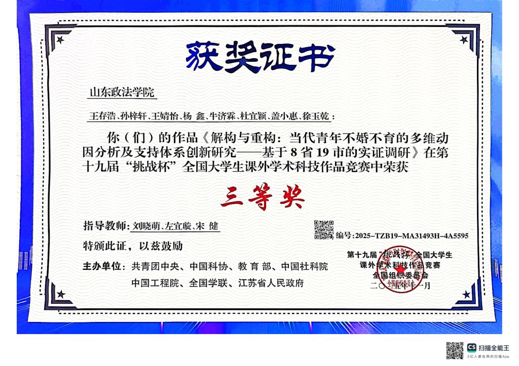 近日,由共青团中央、中国科协、教育部等部门联合主办的第十九届“挑战杯”全国大学生课外学术科技作品竞赛结果揭晓。山东政法学院参赛项目《解构与重构:当代青年不婚不育的多维动因分析及支持体系创新研究——基于8省19市的实证调研》荣获国家级三等奖,实现我校在该项赛事上的新突破。