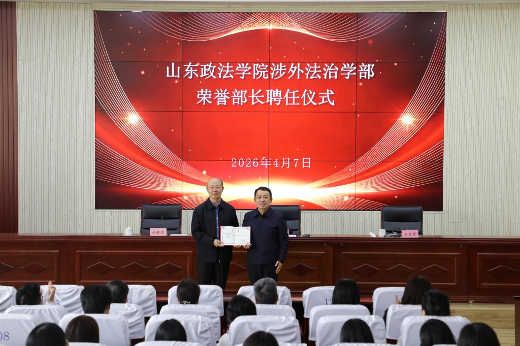 4月7日下午,山东政法学院“涉外法治名家讲坛系列讲座·第一期”在知行楼报告厅举行。院长王效彤出席活动,并为海南大学学术副校长张法连教授颁发聘书,正式聘任其为涉外法治学部荣誉部长。学校党委委员、副院长胡晓清主持讲座。