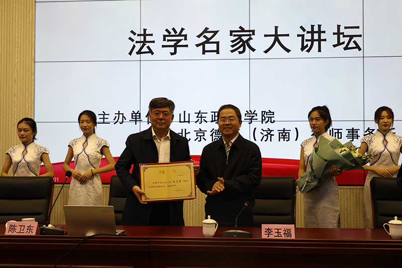 2019年10月23日下午,由山东政法学院与北京德恒(济南)律师事务所共同主办的“法学名家大讲坛”在知行楼学术报告厅成功举办。长江学者特聘教授、中国人民大学法学院博士生导师陈卫东教授应邀为我校做了一场题为《刑事诉讼法的修改与适用》的讲座。山东政法学院党委书记李玉福教授出席讲坛并为陈卫东颁发了客座教授聘书,我校师生及公安机关、检察机关、律师等法律实务界人士300余人聆听了讲座,刑事司法学院副院长张爱艳教授主持。