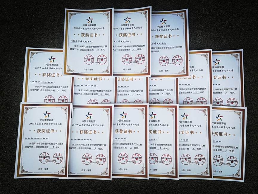 2019年10月19日至20日,在山东省体育局、教育厅联合主办的2019年山东省学校健身气功比赛中,山东政法学院代表队喜获“自选项目气舞”集体赛二等奖、“规定项目易筋经”集体赛三等奖和体育竞赛道德风尚奖,这是我校首次参加该项赛事。