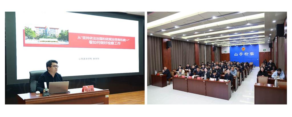 在山亭区检察院,赵京朝以“从‘坚持依法治国和依规治党有机统一’看如何做好检察工作”为主题,重点围绕检察理念现代化、检察机关政治定位、法治价值观等实践要求展开深入解读。山亭区检察院、法院、公安局等相关人员参加培训。