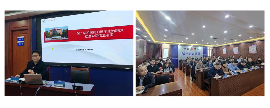 在邹平市司法局,赵京朝副教授从科学立法、严格执法、公正司法、全民守法等关键环节切入,结合典型案例深入剖析法治建设的重点任务。邹平市司法局全体干警参加学习。