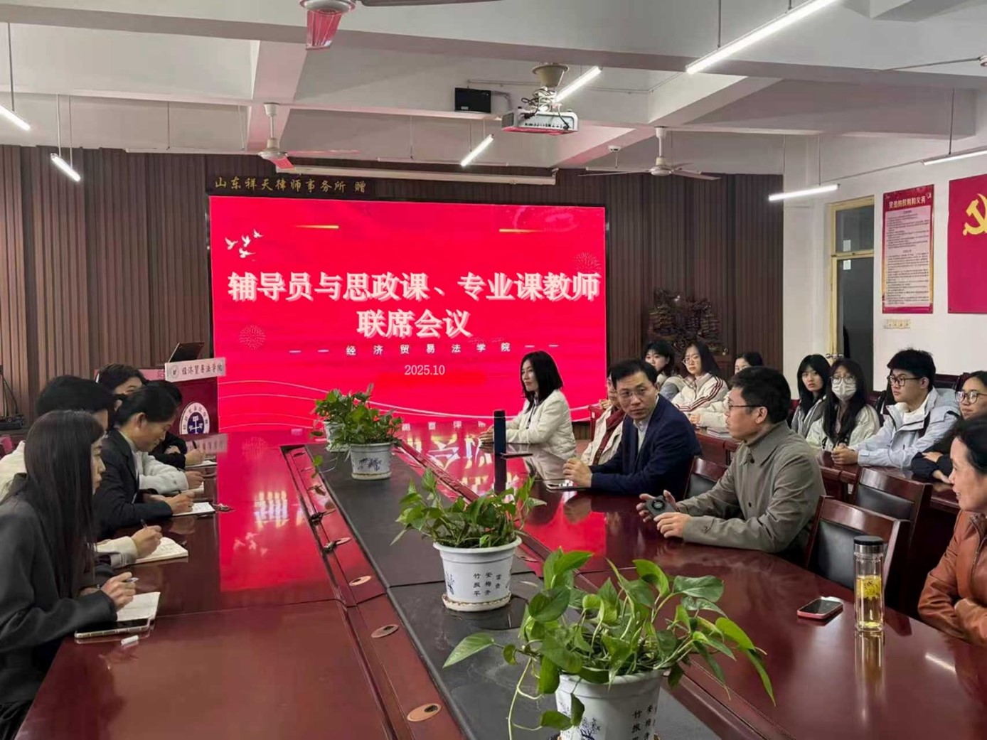 为凝聚育人共识,以饱满的精神状态和扎实的工作成效迎接本科教育教学审核评估,10月23日,经济贸易法学院组织召开辅导员、思政课教师和专业课教师联席会议。学院党委副书记王晓瑜,部分思政课、专业课教师,辅导员,学生代表参加会议。