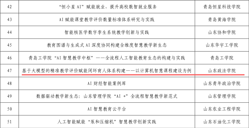 近日,山东省高等教育学会公布了2025年“人工智能+高等教育”典型应用场景案例评选结果,我校推荐的《基于大模型的精准教学评价赋能闭环育人体系构建》案例成功入选。本次评选共遴选出全省本科高校典型案例55项。