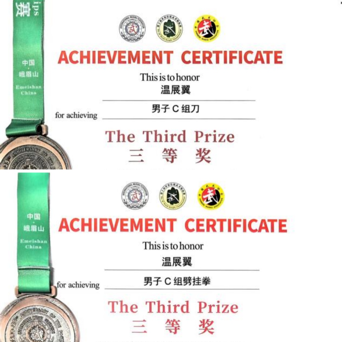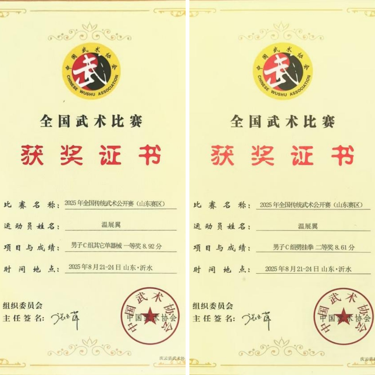 温展翼同学曾多次参加国际、国家及省级武术比赛,屡获殊荣。在今年暑假举办的中国传统武术比赛(山东赛区)中,他曾荣获劈挂刀项目一等奖与劈挂拳项目二等奖。此次再度在国际舞台上脱颖而出,充分展现了我校学子精湛的专业技能与昂扬的精神风貌。