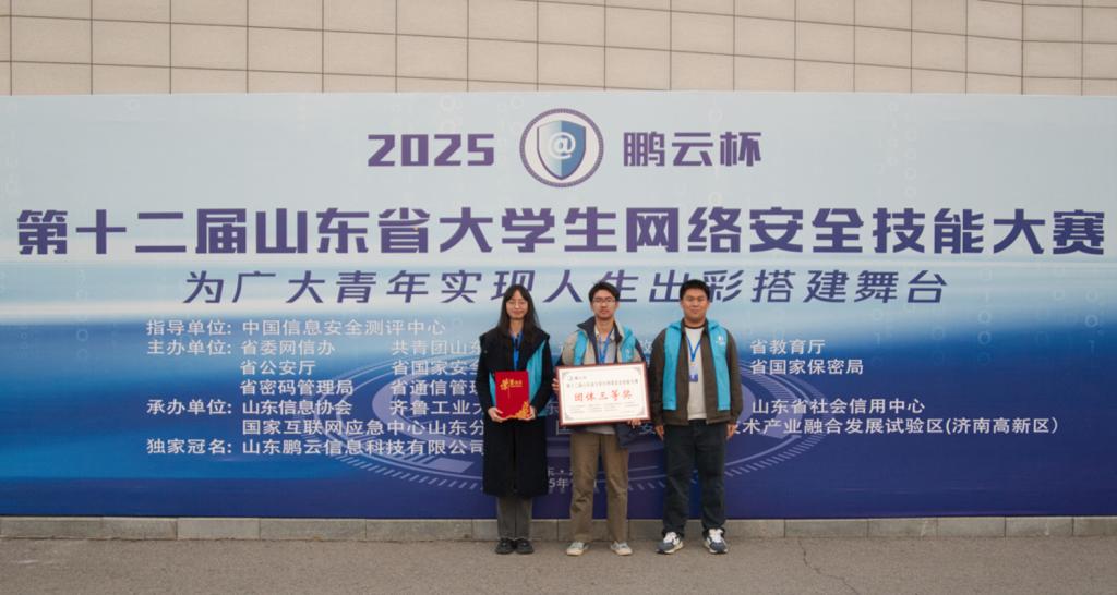 10月26日,“鹏云杯”第十二届山东省大学生网络安全技能大赛在齐鲁工业大学长清校区举行。网络空间安全学院顾翔瑞、王俊霖、张铂璐等三位同学代表学校参加此次大赛,最终位列31名并荣获团体三等奖。