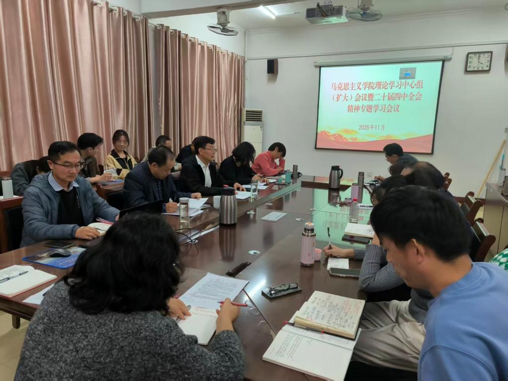 为深入学习贯彻党的二十届四中全会精神,11月6号,马克思主义学院召开理论学习中心组扩大会议暨党的二十届四中全会精神专题学习会议。学院领导班子成员、各教研室主任及全体教师参加会议,会议由党总支书记陈志勇主持。