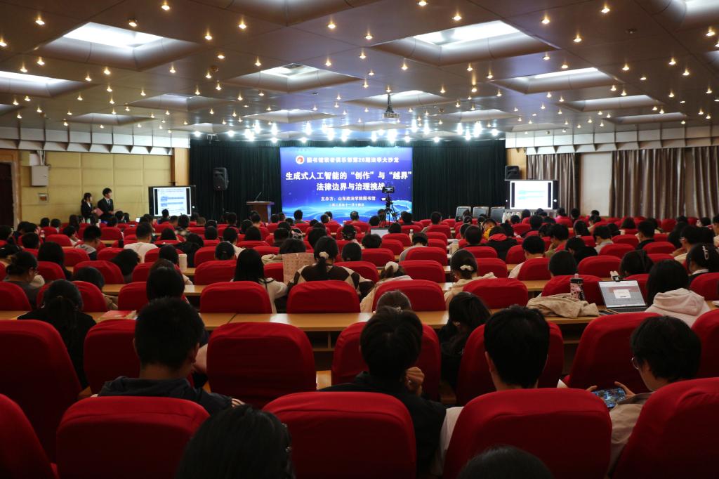 11月14日,读者俱乐部第二十六期法学大沙龙在图书馆五楼学术报告厅成功举办。本次活动以“生成式人工智能的‘创作’与‘越界’:法律边界与治理挑战”为主题,特邀网络空间安全学院副院长吴剑教授、刑事司法学院副院长孙杰副教授、民商法学院于晓副教授、经济贸易法学院王义松副教授和山东圣义律师事务所国际业务部主任李美律师担任主讲嘉宾。图书馆馆长胡杨参加活动并致辞。读者俱乐部校友代表及在校师生共300余人参与活动,