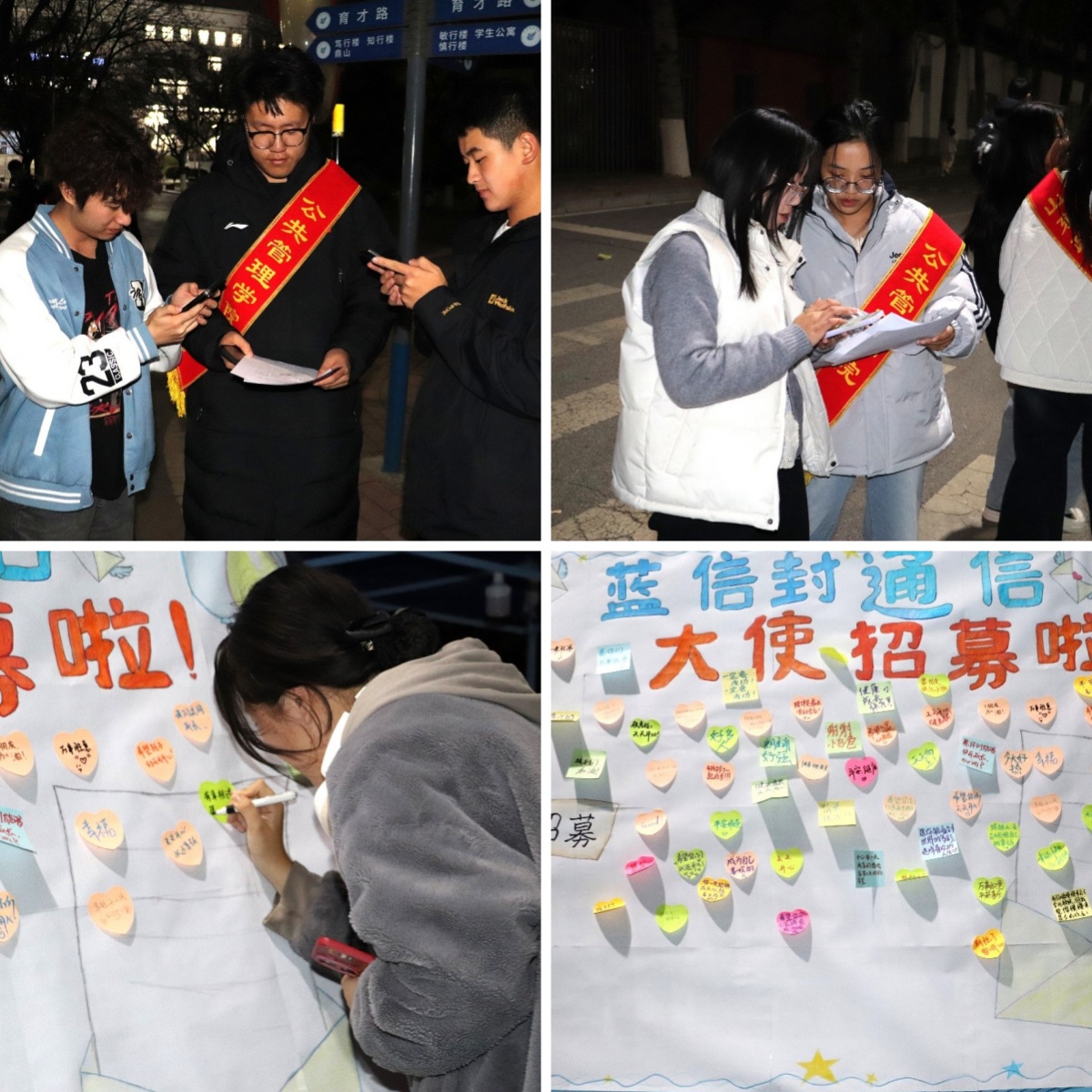 为缓解乡村留守儿童的情感陪伴需求,传递社会温暖与人文关怀,助力其形成健康积极的人生观念,近日,公共管理学院团委学生会在文体馆路和育才路交汇处组织开展“纸笔传情,洞见心声”蓝信封高校大学生与山区留守儿童通信宣传活动。