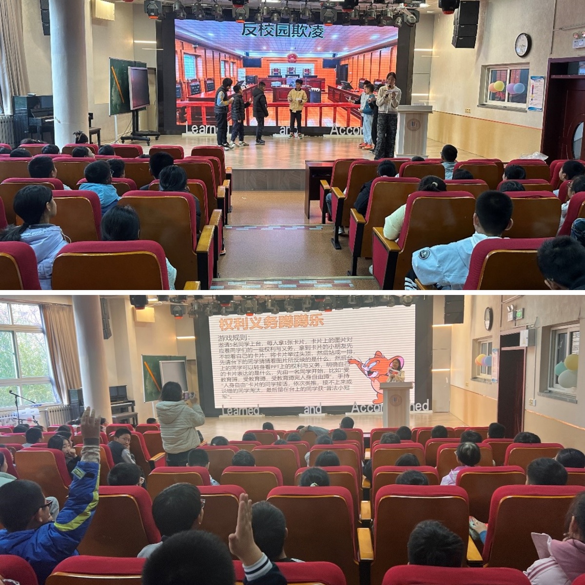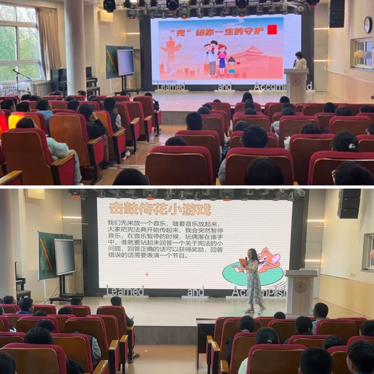 为深化学习效果,活动设置了多个宪法主题互动环节:“法词连连看”帮助学生在游戏中掌握“受教育权”“人身自由”等核心概念;“模拟小法庭”则让学生角色扮演法官、律师等,沉浸式体验一起校园欺凌案件的审理过程,理解宪法如何通过司法程序保障每个人的权利;“击鼓传花——宪法知识问答”让读本随鼓声传递,鼓停答题,寓教于乐;“权利义务蹲蹲乐”游戏中,学生手持写有“劳动权”“维护国家统一”等内容的卡片进行趣味接力,在互动中理解权利与义务相统一的宪法精神。大庄小学张老师在活动后表示:“这次宣讲形式新颖、内容生动,孩子们坐得住、听得进、记得牢,真正为他们系好了第一颗‘法治扣子’。”