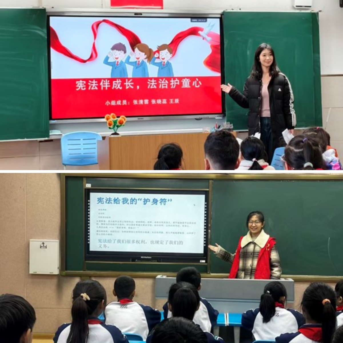 针对小学生的认知特点与兴趣导向,法治辅导员团队精心设计教学方案,将宪法条文转化为“故事讲述+互动交流”的趣味课堂。活动以动画短片《宪法是什么》引入,围绕“校园生活”“自我保护”等贴近学生的话题展开互动问答。“大家知道为什么我们能在安全的校园里学习吗?这背后正是宪法规定的国家发展教育事业、保障公民受教育权的体现!”“遇到不当对待时,宪法能为我们做什么?它保障我们的人格尊严不受侵犯!”一个个贴近生活的问题,巧妙连接具体情境与宪法原则,迅速点燃了课堂讨论氛围。
