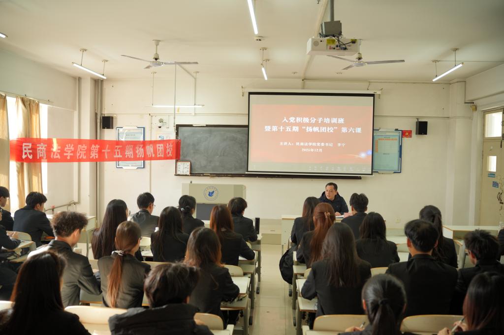 为深入学习宣传贯彻党的二十届四中全会精神,落实党建带团建工作机制,切实提升入党积极分子及团学骨干的思想政治素养与实务工作能力,12月4日,民商法学院党委书记李宁为学院入党积极分子及第十五期“扬帆团校”学员讲授专题党课。
