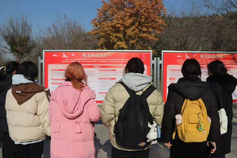 为深入学习宣传贯彻习近平法治思想,进一步强化广大师生的宪法意识、筑牢国家认同,12月4日,法学院与中共山东省委台湾工作办公室联合举办“宪法与国家统一”主题宣传教育活动。本次活动以专题展板为主要载体,融法治教育与爱国主义教育于一体,为师生呈现了一堂生动而深刻的“宪法公开课”。
