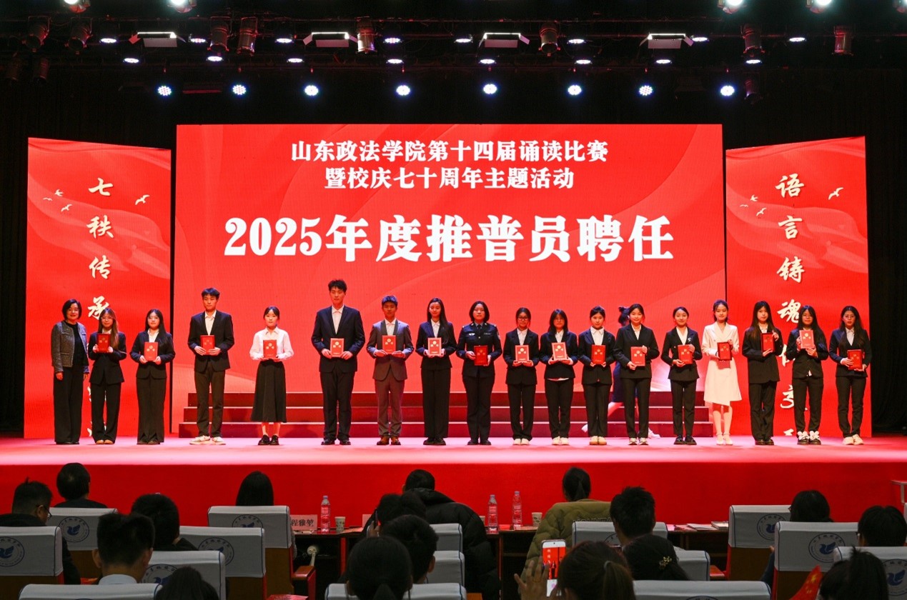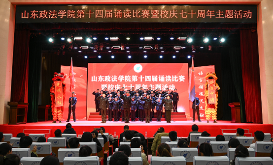 为深入学习宣传贯彻落实党的二十届四中全会精神,庆祝建校70周年,进一步推动山政特色法治语言发展,11月27日,山东政法学院在学校礼堂举办第十四届诵读比赛暨校庆七十周年主题活动。活动由语言文字工作委员会办公室主办,民商法学院承办,来自全校10个二级学院的学生代表齐聚一堂,用深情的诵读为母校华诞献上诚挚祝福。来自山东师范大学、山东教育广播电视台、学校宣传部、教务处的评委专家受邀参会。