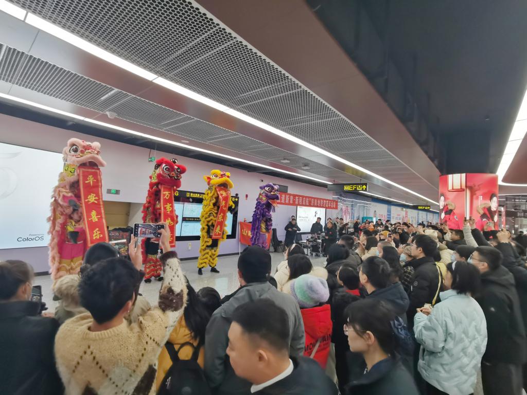 元旦当天,在济南地铁万象城站,贺济南地铁“三线同开”新年活动火热进行,龙狮队队员们在徐妍老师带领下,为乘客们进行了精彩绝伦的非遗舞狮表演《瑞狮迎福》,金黄、朱红相间的雄狮随鼓点跳跃腾飞,吸引了众多乘客驻足观赏、互动拍照打卡,不仅丰富了地铁乘客的文化生活,也进一步提升了龙狮队的知名度和影响力,展现了当代大学生的风采和担当。