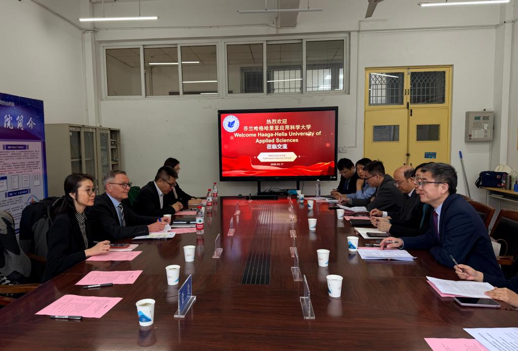 3月17日,芬兰哈格哈里亚应用科学大学副校长Jouni Ahonen、国际处专员Yan Dong一行访问山东政法学院期间,与信息管理与信息系统中外合作办学专业承担单位网络空间安全学院开展座谈交流。国际交流合作处处长高慧,网络空间安全学院党委书记刘振峰、院长常旭等参加座谈会。
