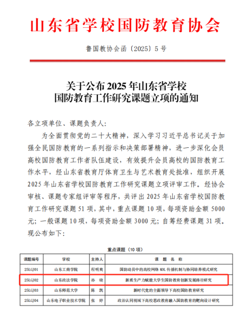 我校辅导员孙晓获2025年山东省学校国防教育工作研究课题立项